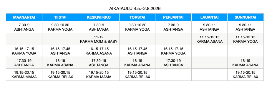 LOPPUKEVÄÄN JA KESÄN AIKATAULU on ilmestynyt! Karma Studion tunnit jatkuvat läpi kesän, joten lämpimästi tervetuloa tunneille myös kesällä.